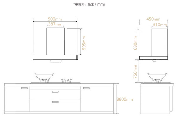 2、為方便煙機(jī)安裝,櫥柜需預(yù)留一定空間,在產(chǎn)品尺寸的基礎(chǔ)上,建議多預(yù)留30㎜