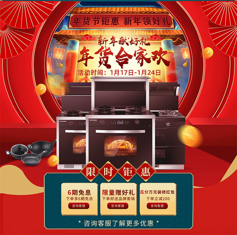 除了“年貨節(jié)”特有活動外,集成灶十大品牌、廚電行業(yè)十大品牌科恩官方旗艦店還有更多的驚喜為你呈現(xiàn),跨店滿減、白條免息、瓜分萬元紅包、幸運抽獎等等。具體活動請前往京東科恩官方旗艦店了解詳情!