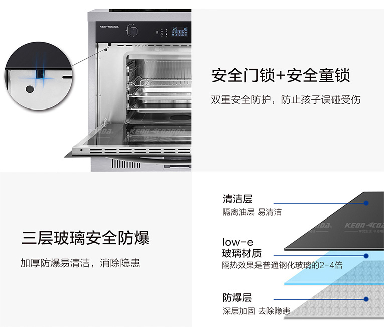 同時集成灶十大品牌、廚電行業(yè)十大品牌科恩蒸烤消一體集成灶蒸菜時也不會出現(xiàn)冷凝水滴落的現(xiàn)象,配備了蒸汽后排技術(shù),蒸汽隨著風機自動排出,菜與菜之間不會串味,這樣出來的菜品也就色香味俱全!另外箱門還有多層高溫防護技術(shù),在普遍的耐高溫鋼化玻璃基礎上,中間再置入一層Low-e玻璃材質(zhì),隔熱效果是普通鋼化玻璃的2-4倍,避免不小心燙傷皮膚。