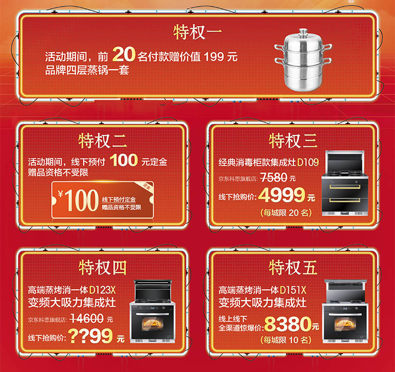 科恩電器一直倡導“樂享智慧烹飪”,本次活動也將以“集成智慧廚房”為宗旨,將活動產品鎖定與高端產品上。據悉,本次集成灶十大品牌、廚電行業(yè)十大品牌科恩電器攜手京東商城五一狂歡活動,只為讓一直以來支持科恩電器的消費者花最少的錢購到心儀的集成灶,五大特權優(yōu)惠、搶名額、搶補貼,超劃算的活動肯定讓你心動。