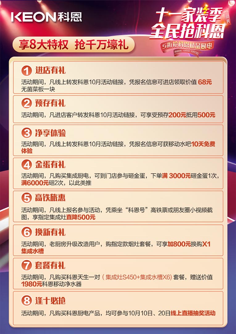 除此之外,集成灶十大品牌、廚電行業(yè)十大品牌科恩十一家裝季全民搶科恩,8大特權(quán)壕禮限時(shí)放送,特權(quán)一進(jìn)店有禮:凡線上轉(zhuǎn)發(fā)科恩10月活動(dòng)鏈接,憑報(bào)名信息可進(jìn)店領(lǐng)取價(jià)值68元無(wú)菌菜板一塊;特權(quán)二預(yù)存有禮:凡進(jìn)店客戶轉(zhuǎn)發(fā)科恩10月活動(dòng)鏈接,可享受預(yù)存200元抵用500元;特權(quán)三凈享體驗(yàn):活動(dòng)期間,凡線上轉(zhuǎn)發(fā)科恩10月活動(dòng)鏈接,憑報(bào)名信息可獲移動(dòng)水吧10天免費(fèi)體驗(yàn);特權(quán)四金蛋有禮:活動(dòng)期間,凡購(gòu)買集成廚電,可到門店參與砸金蛋,下單滿3000元砸金蛋1次,滿6000元砸2次,以此類推;特權(quán)五高鐵旅惠:活動(dòng)期間凡線上報(bào)名參與活動(dòng),憑乘坐“科恩號(hào)”高鐵票或朋友圈小視頻截圖,享指定集成灶直降500元;特權(quán)六換新有禮:活動(dòng)期間,老廚房升級(jí)改造,購(gòu)指定款煙灶套餐,可享加800元換購(gòu)X1集成水槽;特權(quán)七套餐有禮:活動(dòng)期間,凡購(gòu)買科恩天生一對(duì)(集成灶S450+集成水槽X6)套餐,贈(zèng)送價(jià)值1980元科恩移動(dòng)凈水器;特權(quán)八逢十必?fù)專夯顒?dòng)期間,凡購(gòu)買科恩廚電產(chǎn)品,均可參與10月10日、20日線上直播抽獎(jiǎng)活動(dòng)。
