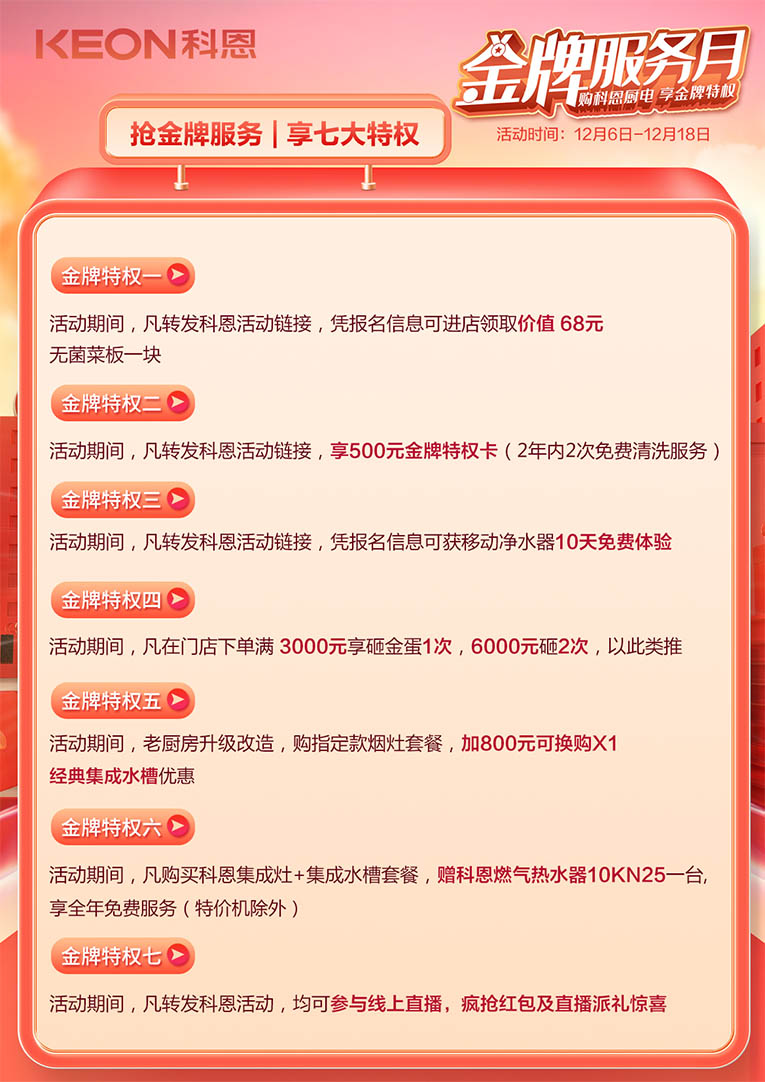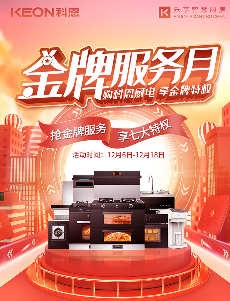 科恩“金牌服務月”經(jīng)過精心籌備盛大開啟,購科恩廚電,享金牌特權!以領軍者姿態(tài),開啟行業(yè)服務新典范。用戶不但可以通過科恩全國專賣店直接獲取服務,還可以通過線上報名、砍價形式獲得權益,結合線下門店金牌服務,聚焦客戶最及時服務需求,七大特權限時搶購!