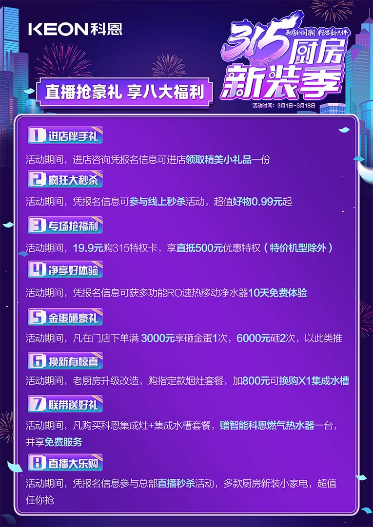 廚房新國潮,科恩新三件~科恩集成灶315廚房新裝季,八大特權(quán)限時大放送!!一進店伴手禮,活動期間進店資訊憑報名信息可領取精美小禮品一份;二瘋狂大秒殺,憑報名信息可參與線上秒殺活動,超值好物0.99元起;三專場搶福利,活動期間19.9元購315特權(quán)卡,享直抵500元特惠特權(quán)(特價機芯除外);四凈享好體驗,活動期間憑報名信息可獲多功能RO速熱移動凈水器10天免費體驗;五金蛋砸豪禮,活動期間凡在門店下單滿3000元享砸金蛋1次,6000元砸2次,以此類推;六換新有驚喜,活動期間老廚房升級改造,購指定款煙灶套餐,加800元可換購X1集成水槽;七聯(lián)帶送好禮,活動期間凡購買科恩集成灶+集成水槽套餐,贈智能科恩燃氣熱水器一臺,并享免費服務;八直播大樂購,活動期間憑報名信息參與總部直播秒殺活動,多款廚房新裝小家電,超值任你搶!