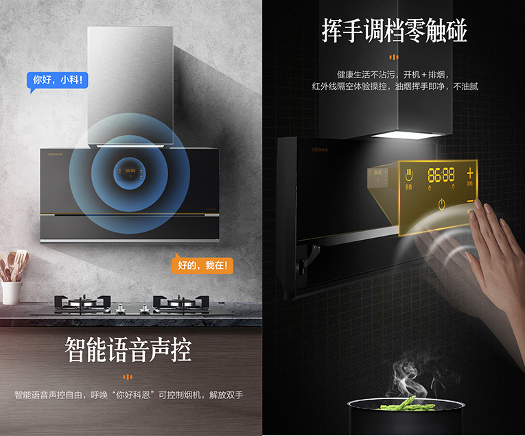 另外,科恩新一代7350變頻大吸力煙機擁有智能語音+揮手操控功能,智能語音聲控自由,呼喚“你好小科”可控制煙機,揮手調檔,紅外線隔空體驗操控,開機+排煙,揮手即凈,不油膩,同時還搭載60S延時關機功能,吸盡熱鍋余煙,人離也能凈油煙。