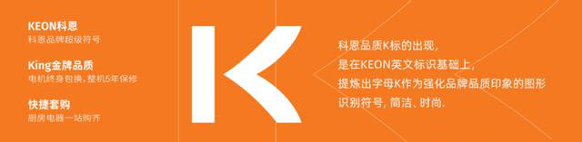 并在KEON英文標識基礎上,提煉品牌超級符號“K”,作為強化品牌品質印象的識別符號,也是King金牌品牌(電機終身包換,整機5年保修),更是快捷套購(廚房電器一站購齊)。