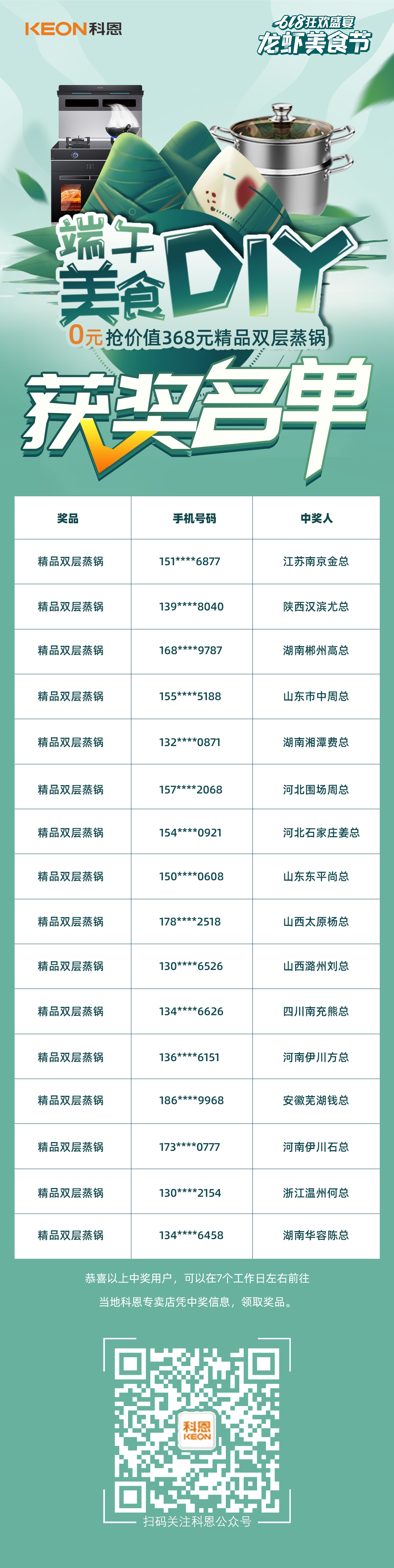 什么?你竟然錯過了這場精彩紛呈的現場直播?麻辣小龍蝦粽子也太厲害了吧!還有0元搶好禮和1元特權卡,這種薅羊毛機會下次一定不能錯過!除了端午美食DIY——學做小龍蝦粽子之外,現場還有0元搶價值368元精品雙層蒸鍋,話不多說,先上獲獎名單,看看你中獎了沒?