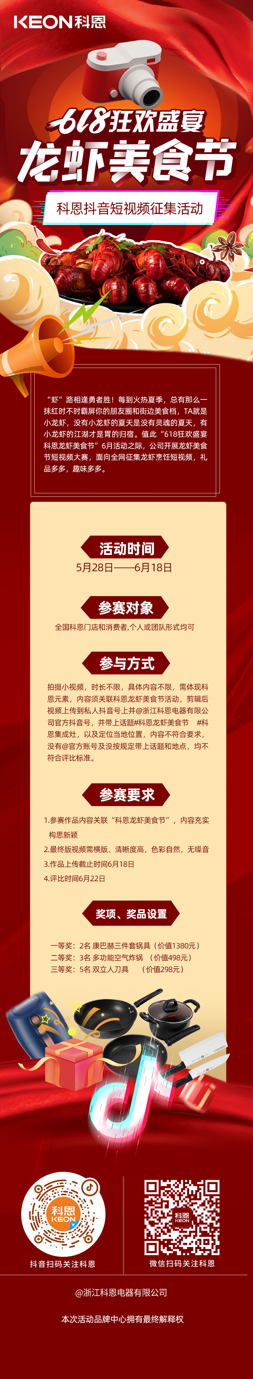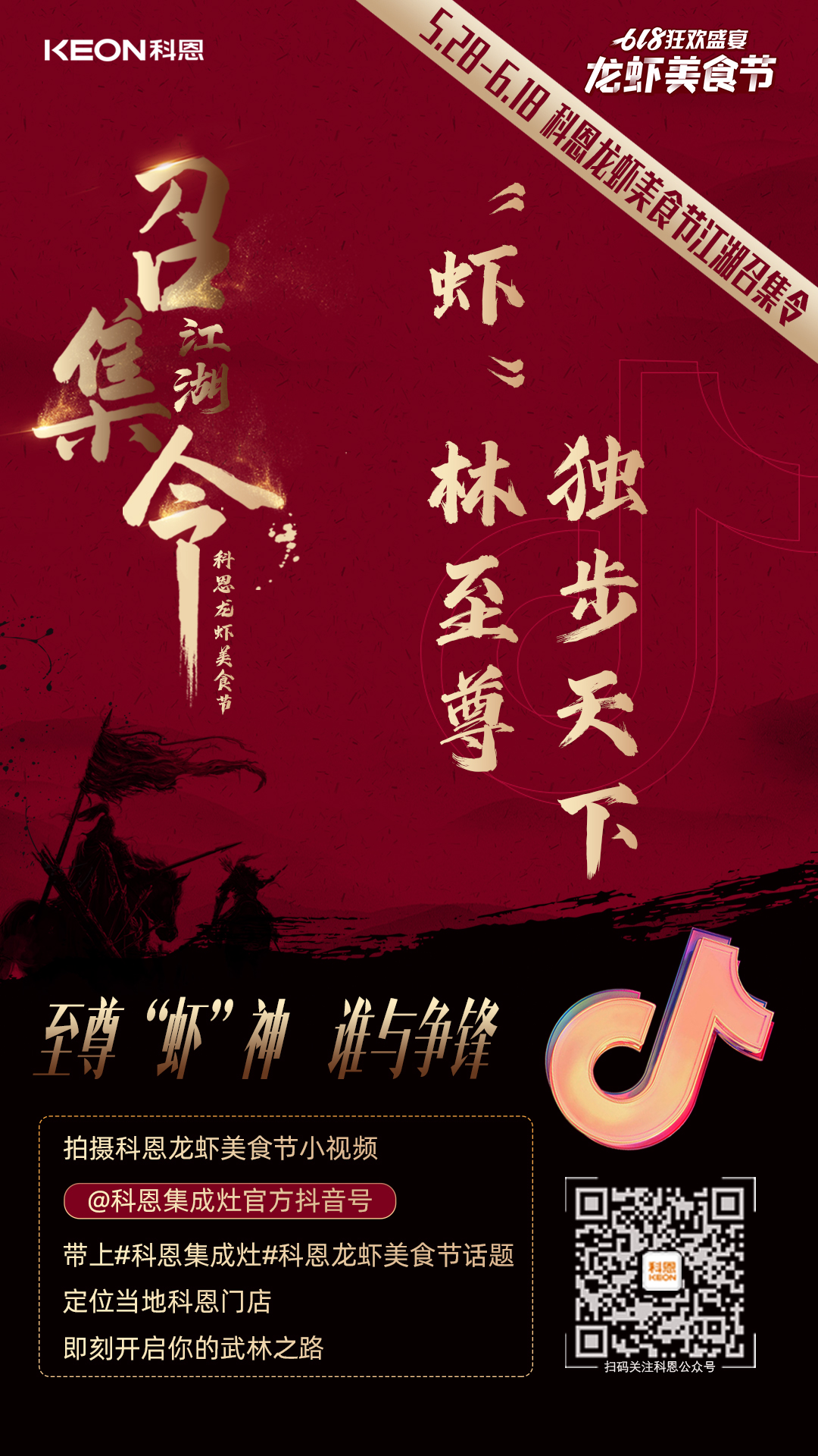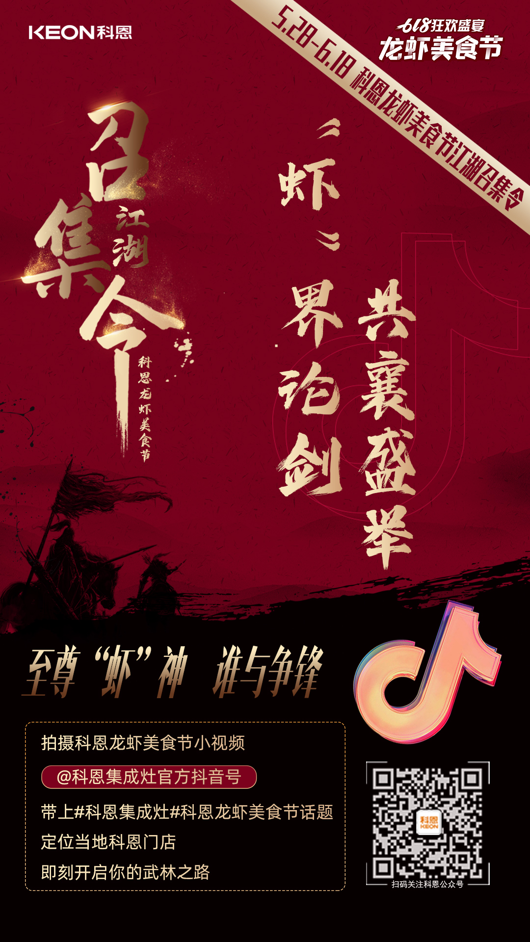 各位俠士,請妥存這份武林大會規(guī)則寶典,江湖美味,缺你不可!只要關(guān)聯(lián)科恩龍蝦美食節(jié),體現(xiàn)科恩元素并上傳至私人抖音號,@浙江科恩電器有限公司官方抖音號,帶上話題#科恩龍蝦美食節(jié) #科恩集成灶,定位當(dāng)?shù)乜贫鏖T店位置即可!