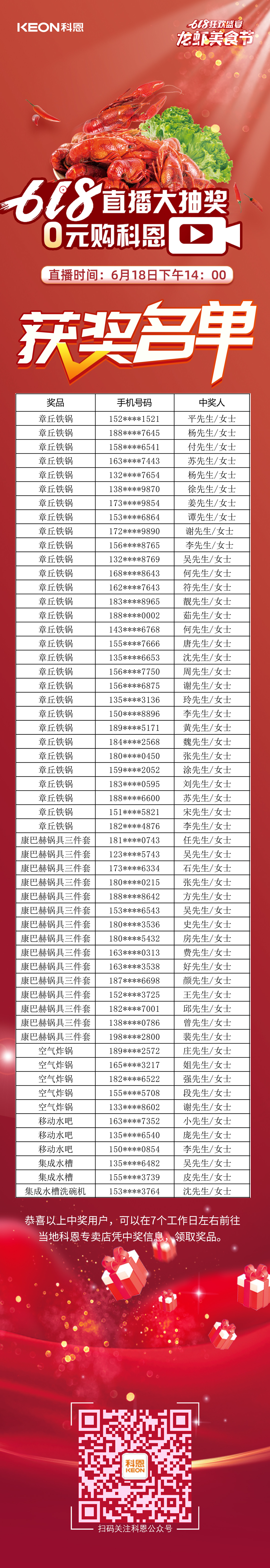 萬人品美食,0元搶科恩——科恩龍蝦美食節圓滿落幕,千城千店,共襄盛舉,感謝大家對科恩集成灶的大力支持,618直播大抽獎獲獎名單火熱出爐,恭喜以上獲獎的小伙伴們,請盡快聯系當地科恩門店,快把獎品領回家吧!