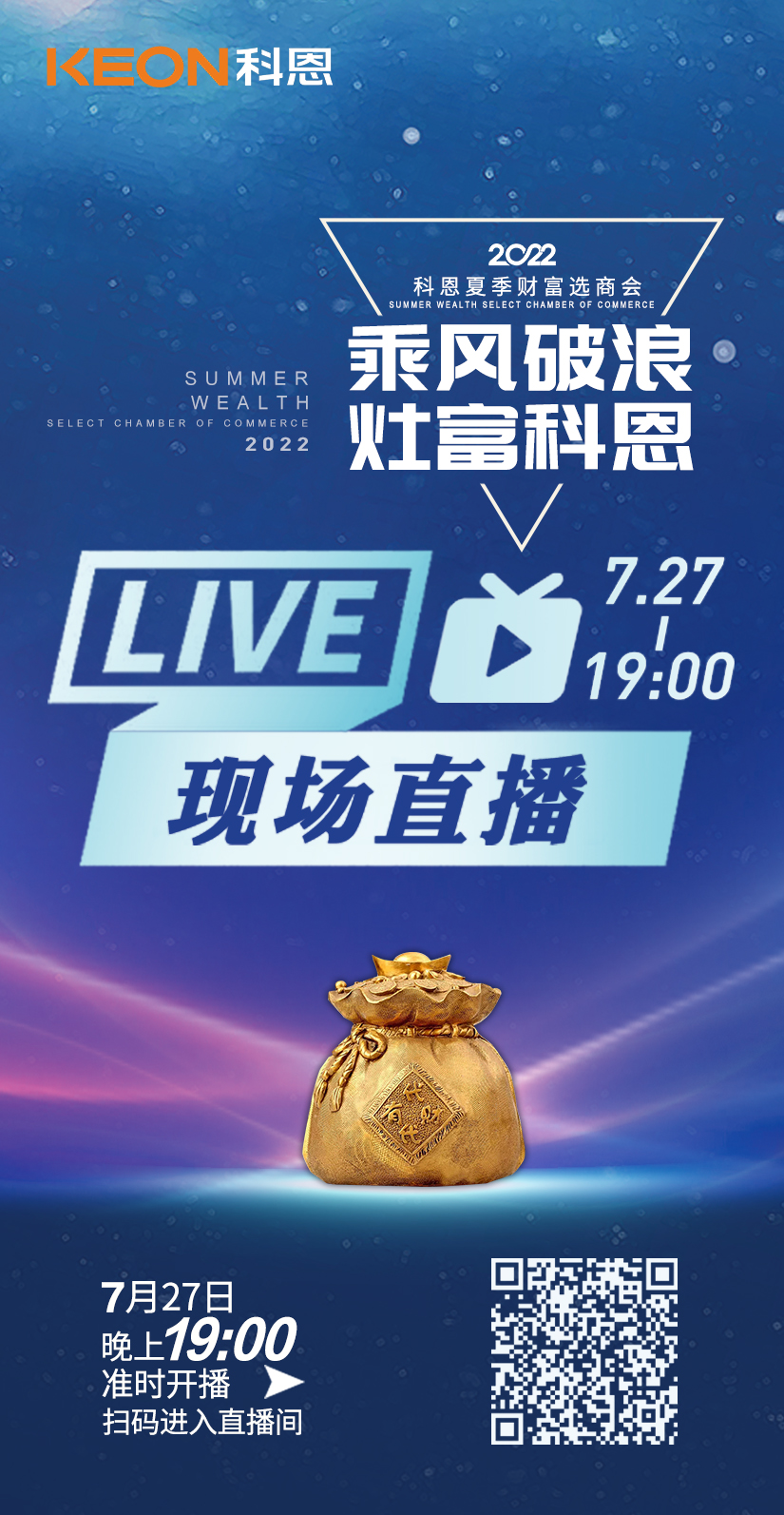 乘風(fēng)破浪·灶富科恩2022科恩夏季財(cái)富選商會(huì)進(jìn)入倒計(jì)時(shí)1天,鑒于疫情呈多點(diǎn)散發(fā)多地頻發(fā)的形式,科恩電器將于7.27晚19時(shí)召開(kāi)全國(guó)直播線上選商會(huì),用直播打破地域局限,“0距離”交流,足不出戶(hù)亦能覓得良機(jī)!