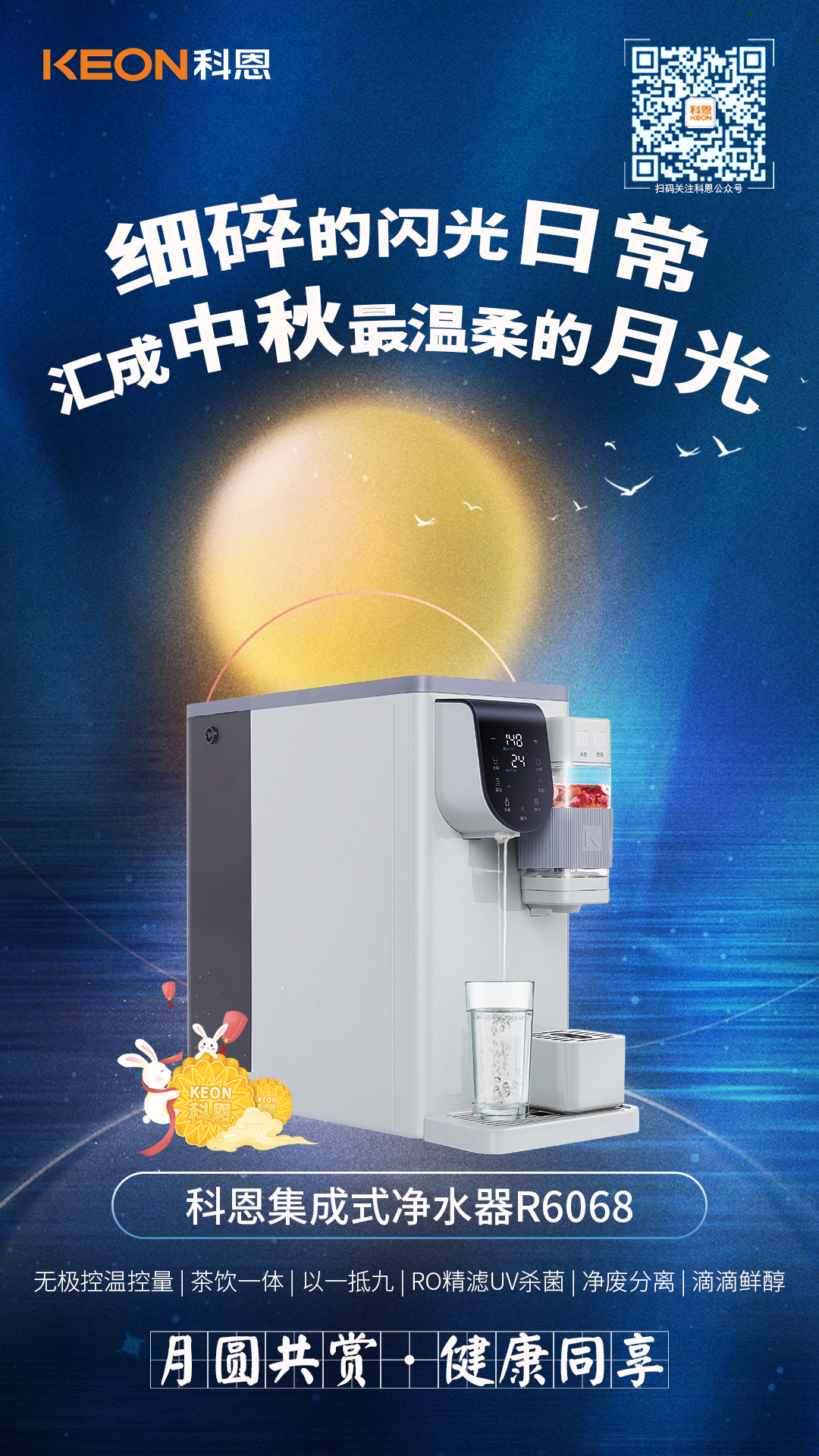 生活是一半人間煙火,一半山河遠闊,你眺望詩和遠方,卻也別忘了家的方向,卸下滿身疲憊,拋開城市的車水馬龍,用一臺科恩集成式凈水器R6068,一杯咖啡一壺清茶一杯溫度適宜的熱水,細碎的閃光日常,倒滿愛的溫度,匯成中秋最溫暖的月光!