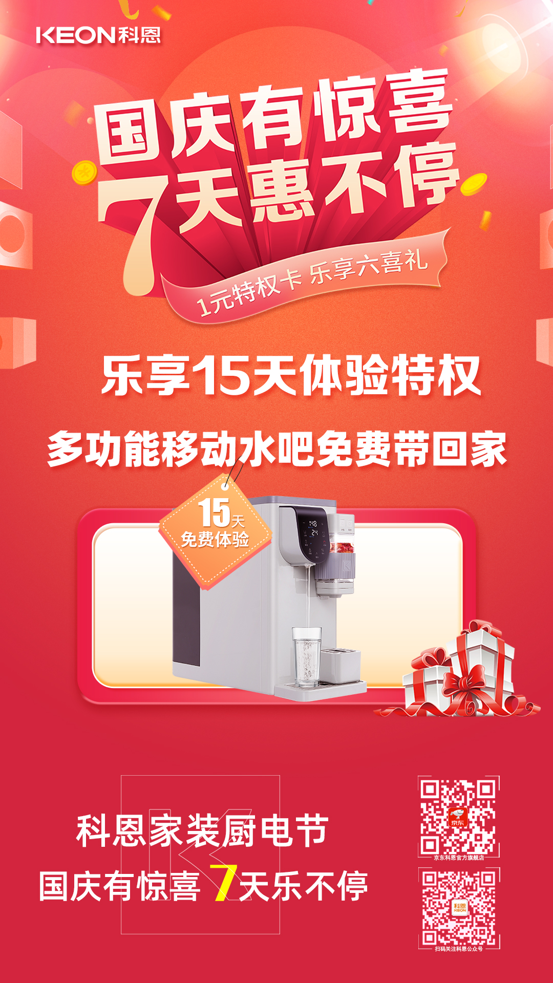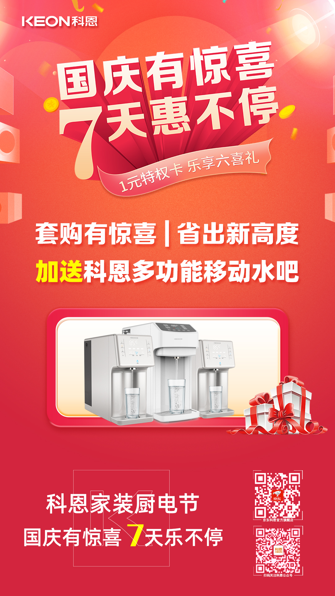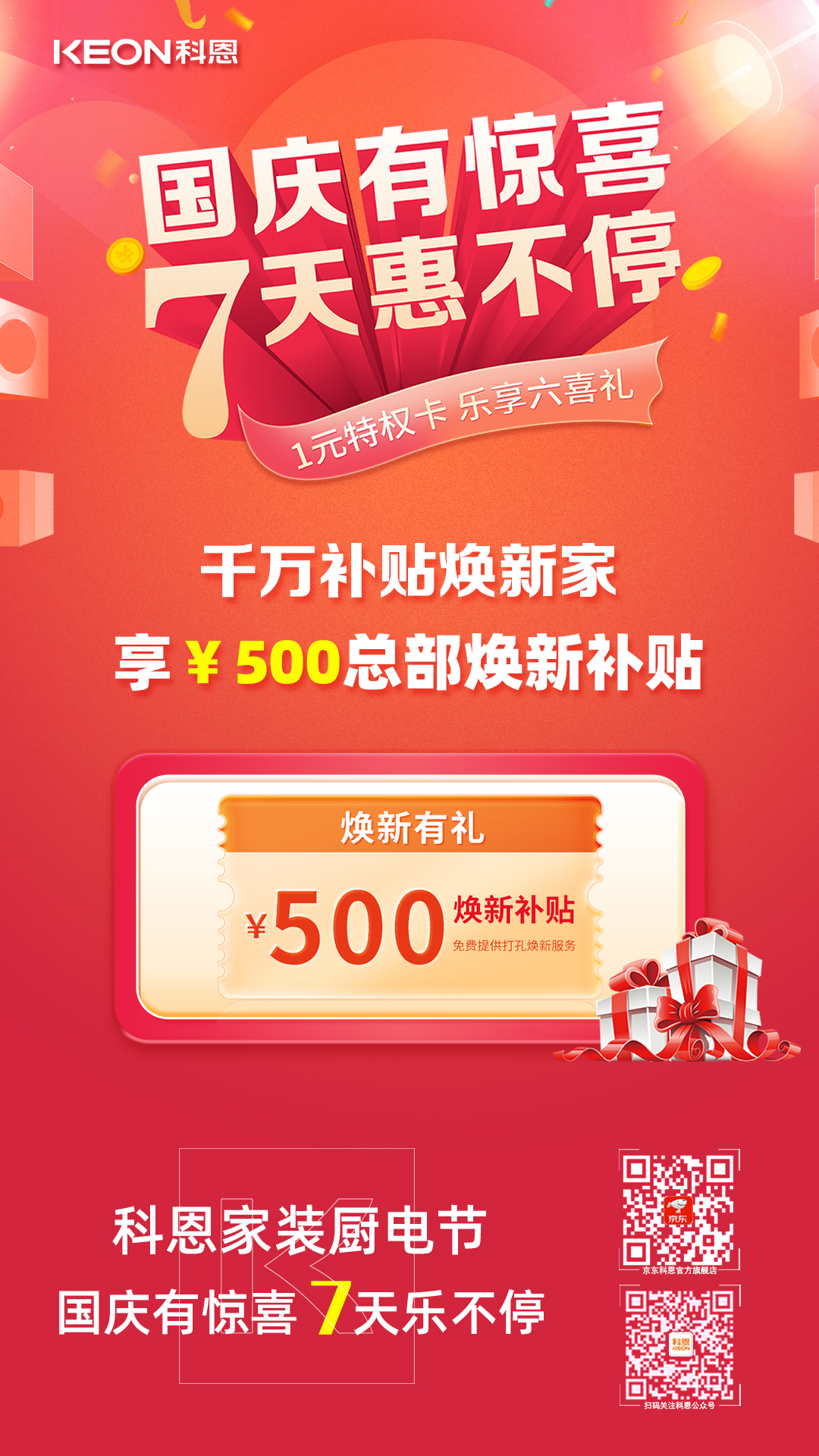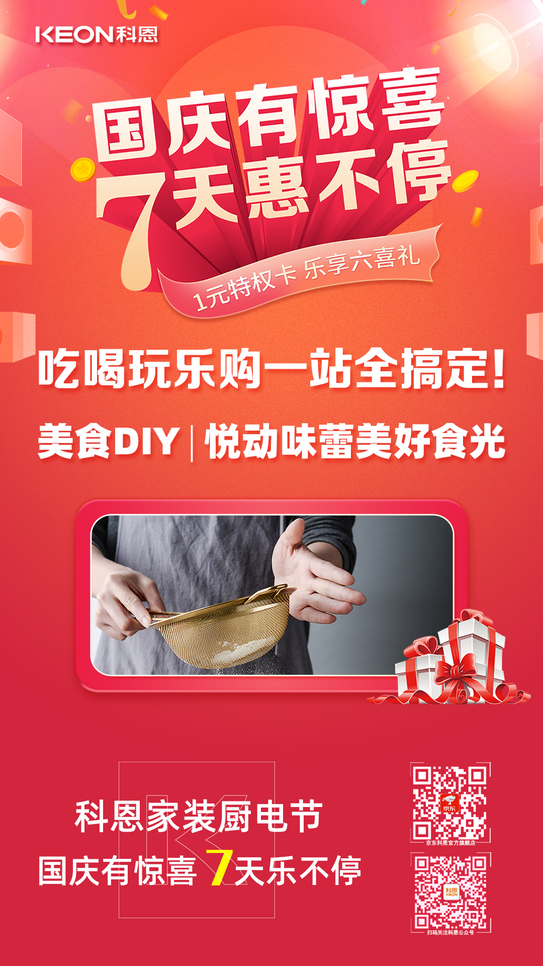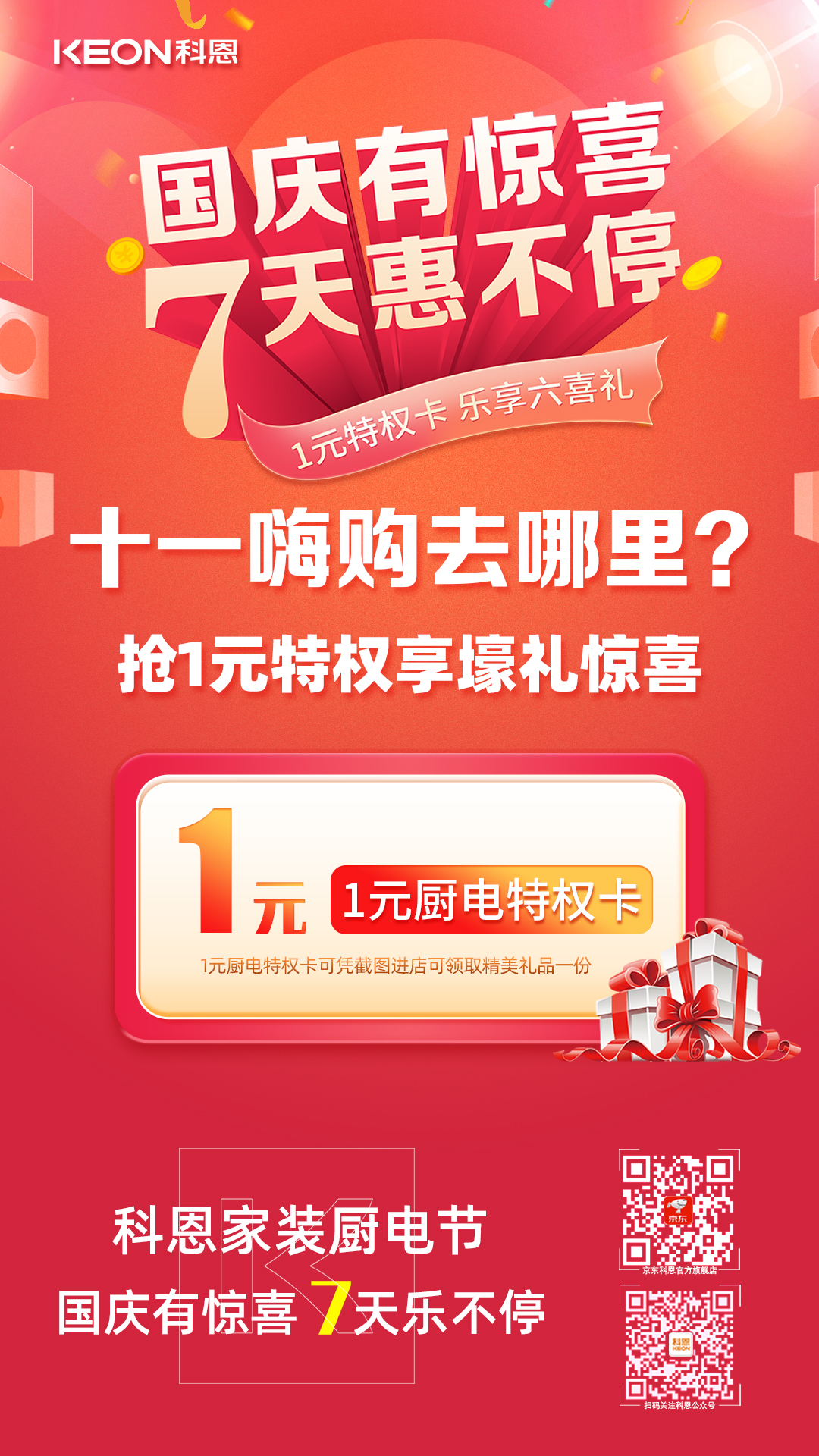 1元瘋搶,給力國慶,科恩家裝廚電節國慶專輯——國慶有驚喜,7天惠不停正火熱進行中,力度空前,更有豪華大禮包驚喜贈送,全民鉅惠,就在科恩家裝廚電節,更多鉅惠活動請詳詢科恩各大門店!