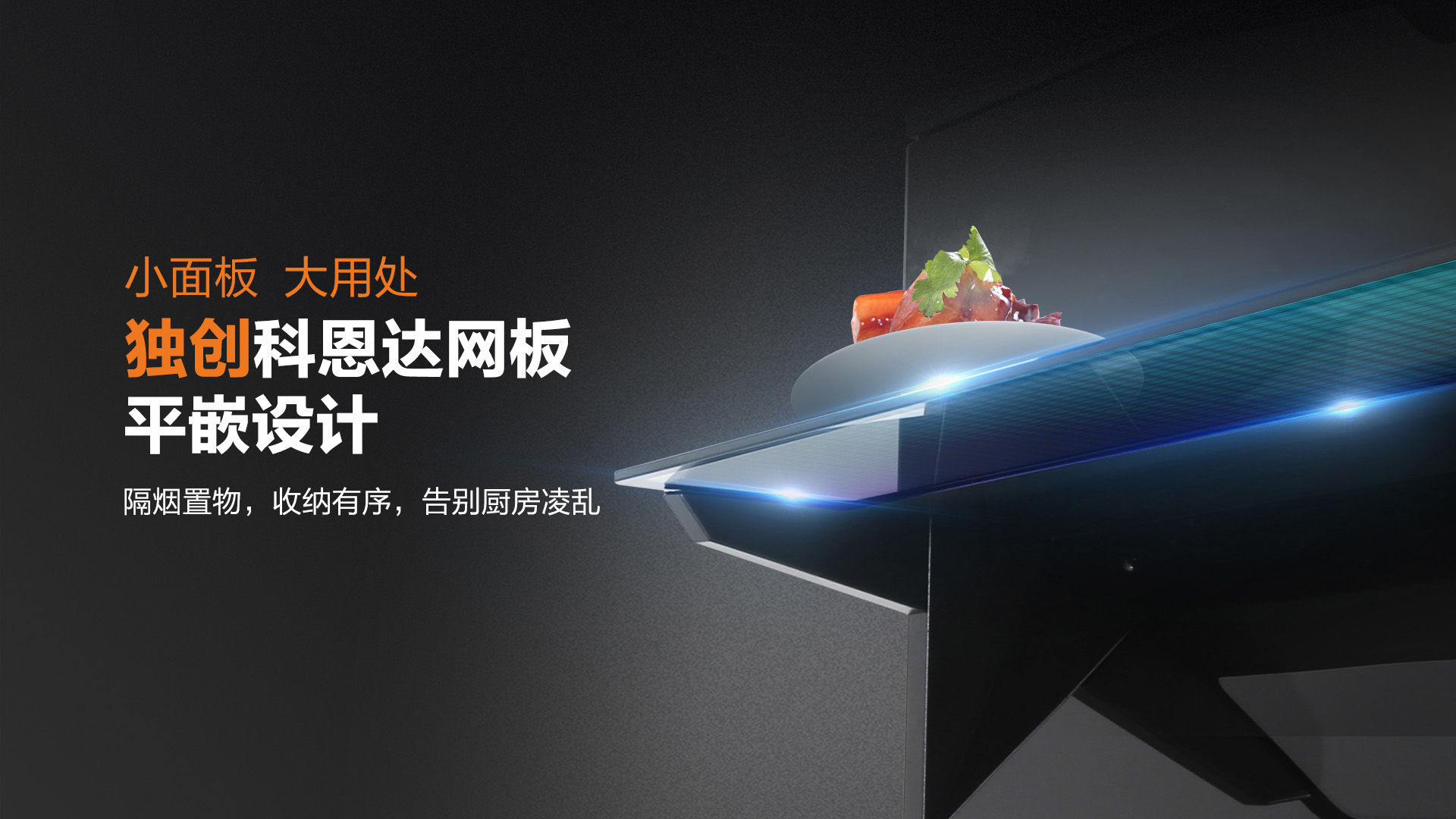 特制的導煙置物板,更是阻絕油煙向上跑的可能,徹底做到油煙不過臉。且在導煙同時,還能置物,烹飪時隨手置放的調味品有了好去處!