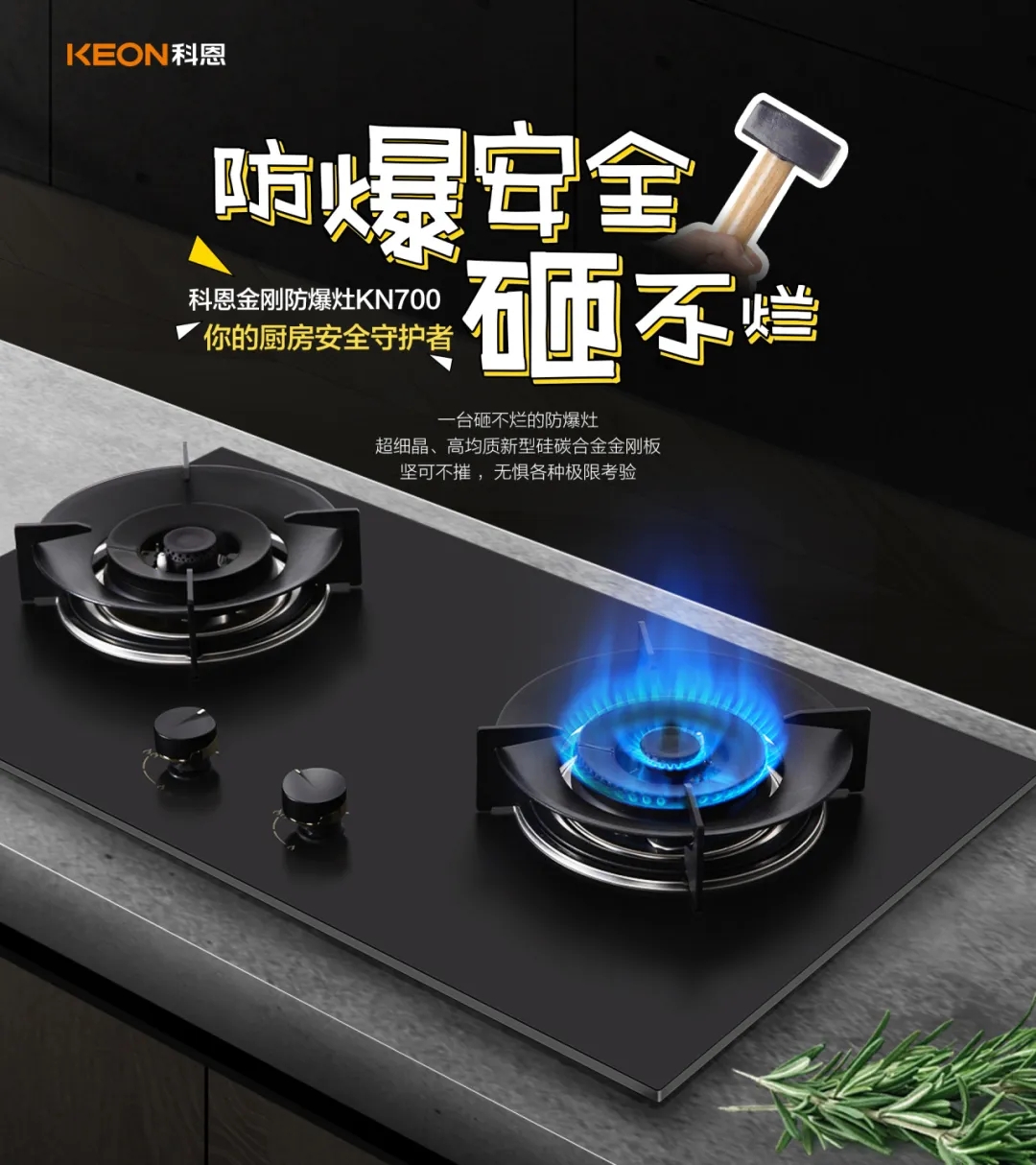 灶具則選擇了科恩KN700金剛防爆灶。近年來廚房事故頻發(fā),灶具炸裂不再少數。因此,科恩KN700金剛防爆灶在材質上選擇了防爆金剛板,硅碳合金特種材質可耐高溫1500℃,高于國標3倍以上,更安全!在抗沖擊方面,防爆金剛板是能抗住工地大鐵錘的暴擊,真正做到0級防爆高硬度,更堅固,更安全!如此有效杜絕了廚房安全事故。