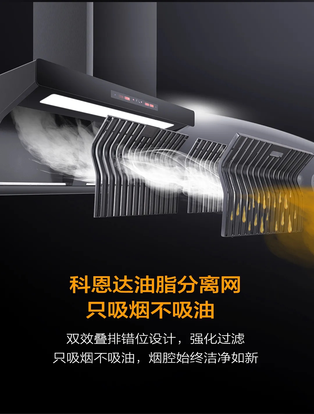 6530免清洗煙機可做到只吸煙不吸油。科恩達油脂分離網采用加厚太空壓鑄鋁,工藝嚴控,通過酸洗-噴砂-特氟龍噴涂-高溫燒結而成,真正易潔、易拆、耐腐、不粘油、好打理且防火阻燃,可分離96%的油脂,讓煙腔內部始終保持潔凈,很好的解決了煙機清洗難題。而整機特氟龍材質真正做到了輕打理,只需輕輕一抹,油污去無蹤。