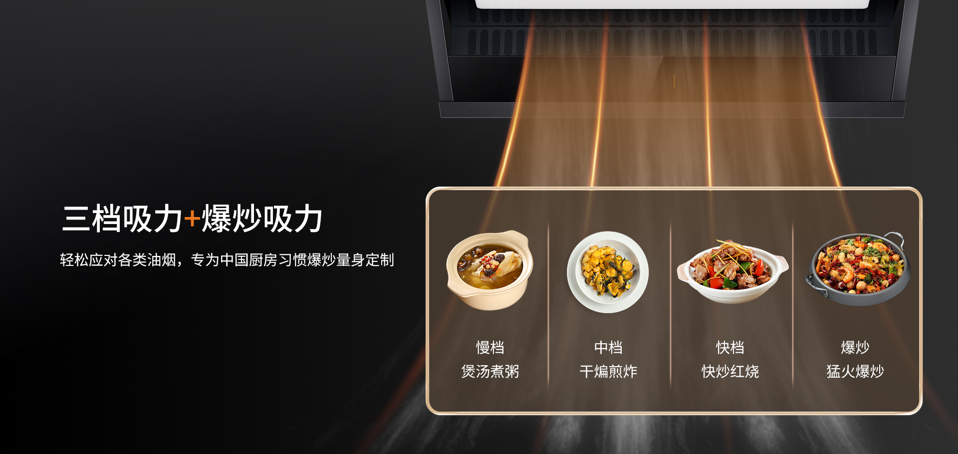 三檔吸力+爆炒吸力,輕松應(yīng)對(duì)各類油煙,專為中國(guó)廚房習(xí)慣爆炒量身定制。