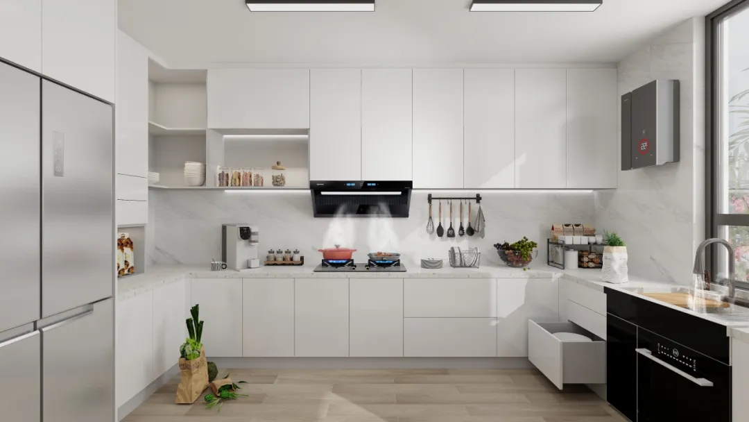煙機方面:科恩5100歐近式超薄油煙機,采用獨特的平嵌式設計,完美融入櫥柜之中。具備23m³/min颶風吸力,可瞬吸濃煙,做到辣味不嗆鼻,妝容不油膩。