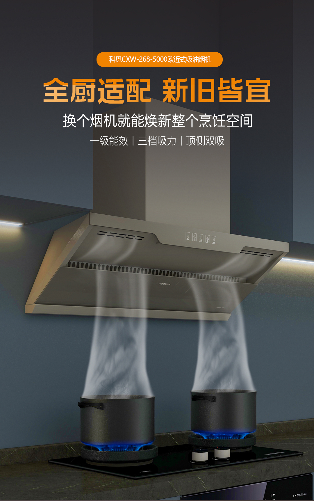 嵌入美學(xué),颶風(fēng)凈界??贫鳉W近式吸油煙機(jī)5000,275mm纖薄機(jī)身平行嵌入櫥柜。太空灰如暮色浸染,適配任意風(fēng)格,敞開(kāi)式攏煙區(qū)擴(kuò)大50%,科恩爆炒時(shí)颶風(fēng)瞬吸,辣味未散油煙已凈。舊廚房的逆襲法則,獨(dú)立安裝不挑戶型,嵌入即高級(jí)。IP67級(jí)LED冷光燈穿透蒸汽迷霧;兩檔吸力+爆炒模式;3分鐘延時(shí)凈煙,余味消散無(wú)蹤;老破小廚房秒變開(kāi)放式料理廳。