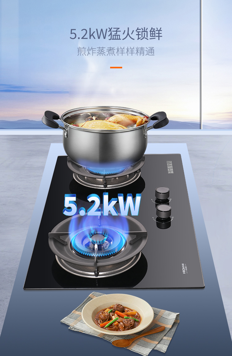 新標(biāo)一級(jí)能效認(rèn)證,超70%熱效率,立體聚能環(huán)加持,防風(fēng)聚熱不流失,高效燃燒省氣,低碳環(huán)保少排放。KN300守護(hù)健康綠色廚房,節(jié)能省錢雙豐收,健康烹飪更安心。猛火精控,百味隨心。5.2KW勁火力,煎炸爆炒夠酣暢,0至170度無(wú)極調(diào)控,文火鎖鮮留營(yíng)養(yǎng),武火炒肉保嫩香,燃燒器雙針卡位點(diǎn)火穩(wěn),高效燃燒不跑偏,中西菜式皆能掌控,廚藝發(fā)揮更出色。
