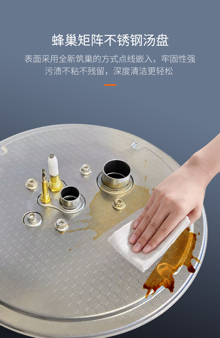 蜂巢矩陣湯盤,點(diǎn)線嵌入更牢固,污漬不粘無(wú)殘留,深度清潔更輕松。可拆卸火蓋,獨(dú)立清理無(wú)死角,不銹鋼爐頭耐腐,高溫炙烤不變形,搪瓷鍋架防滑落,耐用又省心,烹飪之后巧清理,省時(shí)省力更高效。