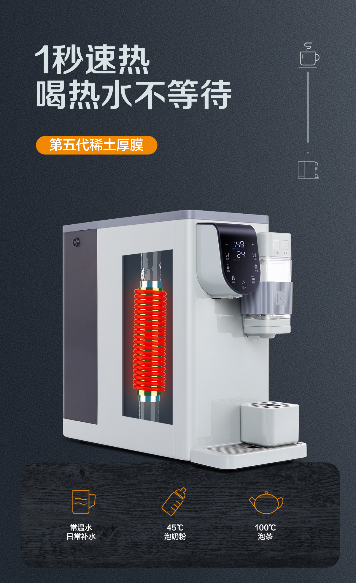 • 無(wú)極控溫控量,1秒速熱,飲水水溫水量隨心所控
