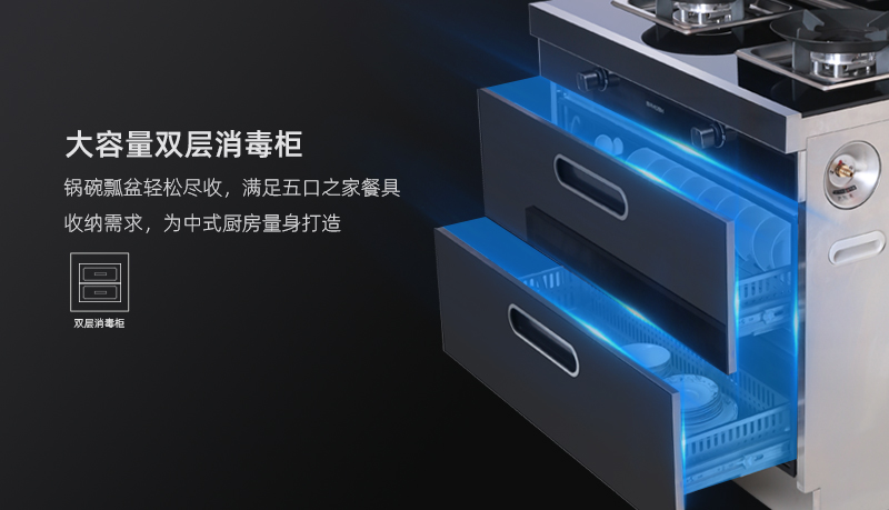 大容量雙層消毒柜,鍋碗瓢盆輕松盡收,臭氧+紫外線雙重消毒,深層殺死細(xì)菌