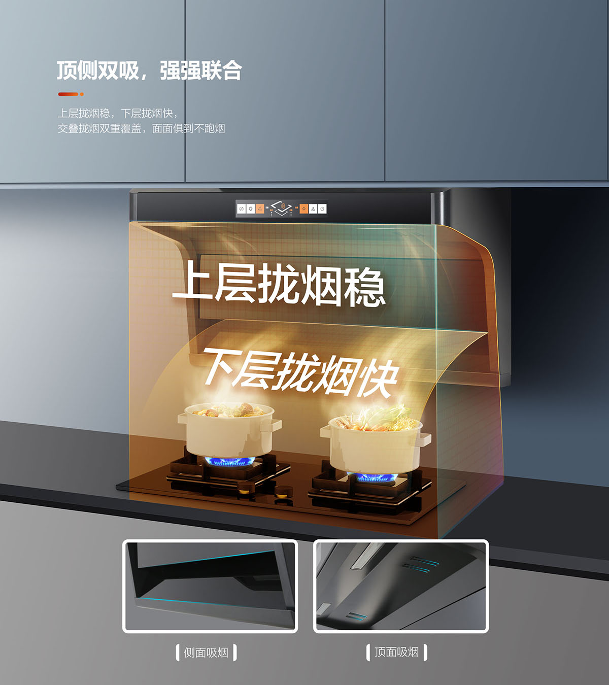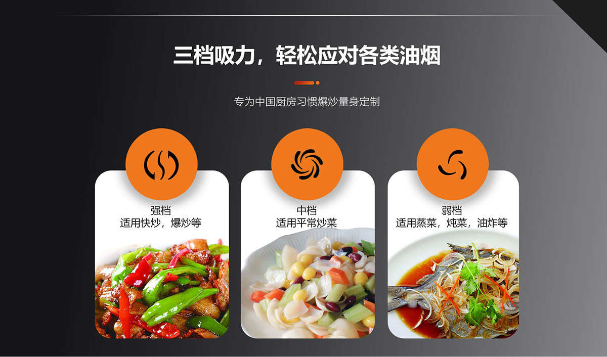 三檔吸力,輕松應(yīng)對(duì)各類油煙,專為中國(guó)廚房習(xí)慣爆炒量身定制