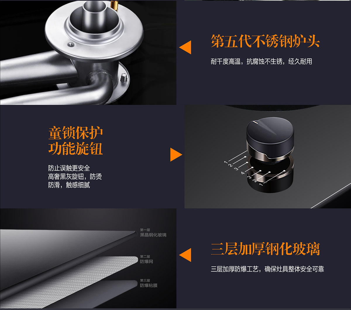 材 質:防爆鋼化玻璃面板、一氣一電灶具、猛火直噴