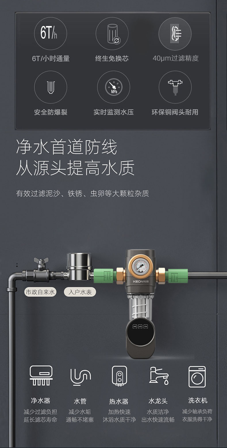 • 6噸/小時大流量,快速過濾,用水無壓力