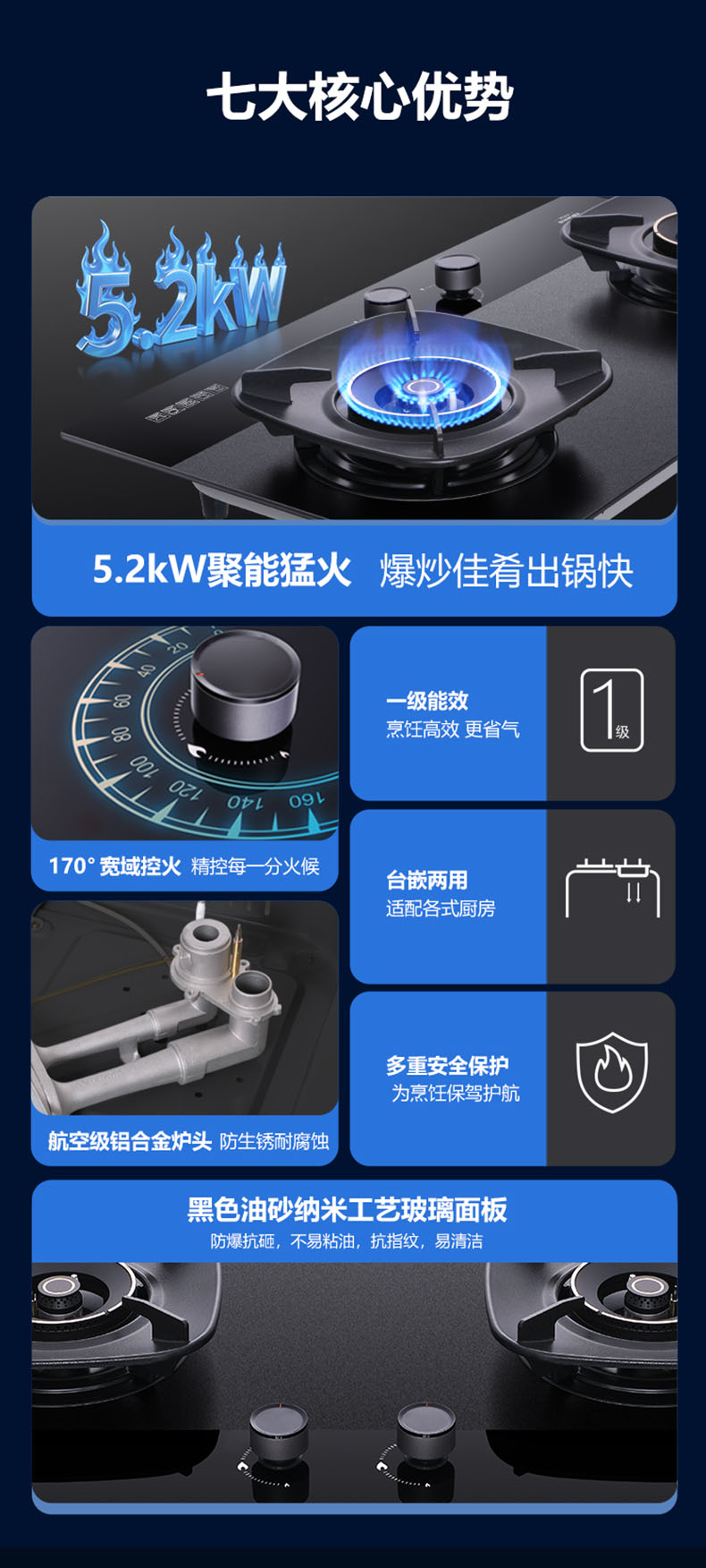 • 三噴引射,立體進氣,5.2kW大火力盡享爆炒